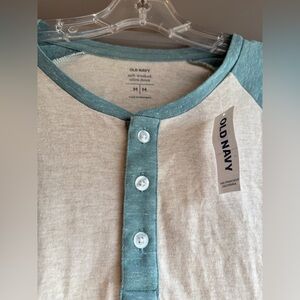 Stylish cream and teal long sleeve Henley shirt. Features a button-up neckline. From old navy cotton blend.