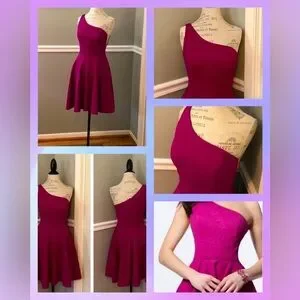 Fuchsia Shimmer One Shoulder Formal Cocktail Dress. Padded Bra, Nude Illusion Side Panels, Flare Skirt With Pockets, Zip Back & Hook. It's Exquisite!
