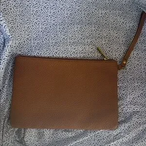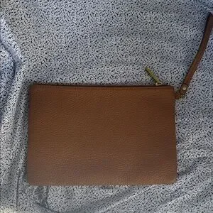 NWOT Brown leather clutch. Features wristlet strap. Gold-tone zipper accent. Perfect for any occasion.