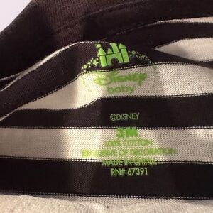 Black and white striped t-shirt featuring Mickey Mouse with red suspenders.