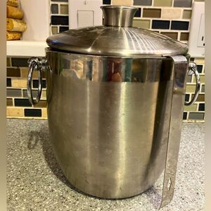 This ice bucket and tongs are in excellent condition. They’ve only been used a couple of times. The bucket is stainless steel with handle detail on both sides and a well fitting lid.