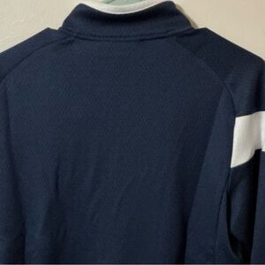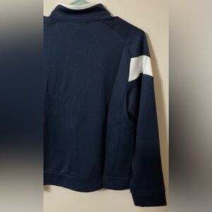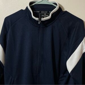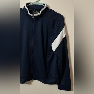 Navy jacket with white details. Full zip closure. Front pockets with zippers. Comfortable and stylish. 100% polyester microfiber with wicking properties.