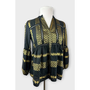 Kasia Blouse Black & Gold Balloon Sleeve Boho Geometric Babydoll Top Size Small