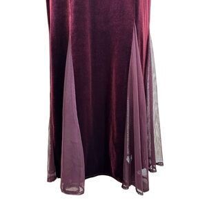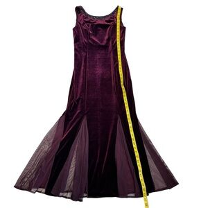 Burgundy velvet maxi dress. Beaded and sequin detail at neckline, v-neck, mesh panels on skirt for subtle mermaid silhouette, back zip closure. Polyester/Spandex blend.