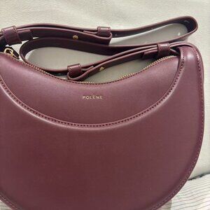 Polene Crescent Bag, made of burgundy leather, has a smooth and delicate feel. The bag is elegantly shaped and can be worn on one shoulder or across the body, with an adjustable shoulder strap. The perfect size for everyday storage, including a phone, wallet, and cosmetics. The gold hardware is exquisitely crafted, and the interior is clean and tidy. It shows no obvious signs of wear and tear, and is practically new.