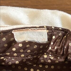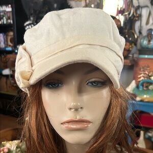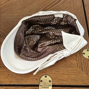 This elegant and stylish vintage 60’s Cream Hat has Pageboy influences and features a stylish bow. I believe it to be wool but the tag has faded. It’s a perfect accessory for any occasion and combines fashion with comfort. Inside lined in a satiny brown and metallic gold polka-dots fabric. Inside circumference is approximately 23”. Front cap-style brim is approximately 2-1/4”. In excellent condition. Smoke-free home.