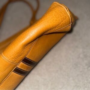 This tan leather shoulder bag features a soft, supple texture and a slouchy, rounded shape. It is designed with two thin leather handles for easy carrying and a secure zipper closure. The bag is accented with two darker brown vertical stripes, adding a touch of contrast and style.