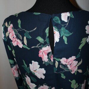 Pretty Rosalinda Navy Blue Floral Print Long Sleeve Shift Dress! Pretty pink, teal, and green floral print dances across this lightweight, woven dress with a wide, rounded neckline, long sleeves with button cuffs, and a straight-cut shift bodice. Back keyhole with top button closure.