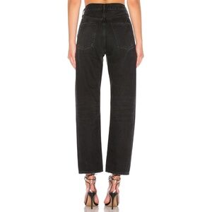 100% cotton. Light fading and whiskering detail. Intentionally destroyed areas. Button fly. 5-pocket design. 18" at the knee narrows to 15.5" at the leg opening. Made in USA. Agolde Style No. A069B 998.