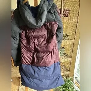 Vibrant puffer jacket with hood. Features a mix of burgundy, black and navy. Ideal for warmth and style.