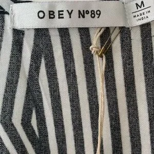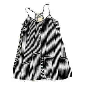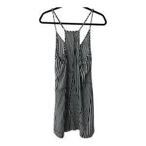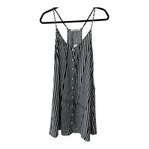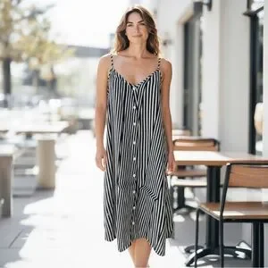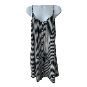 Stylish black and white striped dress with button-down front. Adjustable spaghetti straps, pockets, razor back. Perfect for casual outings.