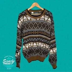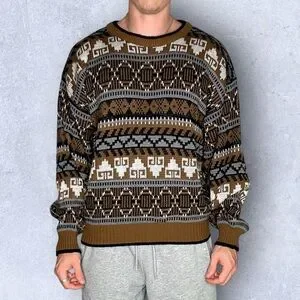 Vintage 80s Weeds Aztec acrylic crewneck sweater. Size mens large. Model is 5'9. Great condition and very high quality. 100% Acrylic. Made in Korea. All over Aztec brown patterned design. Features knitted design, and elastic cuffs and hem. Perfect for fall / winter season.