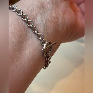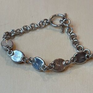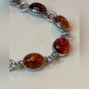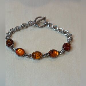 Amber and 925 sterling silver not sure if the toggle clasp is silver. Size 6 3/4 inches. Pre-owned