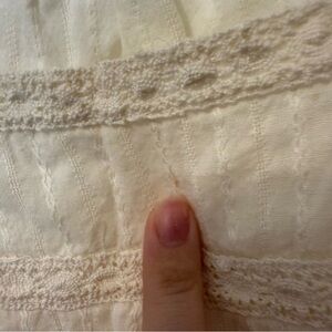 There is only one tiny stain on the front, I am point to it in the last picture.