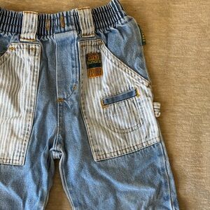 Adorable vintage Gitano toddler boys jeans in size 2T. Features a unique Arctic Hike Tundra Explorer patch, striped contrast pockets, and comfy elastic waistband. 100% cotton denim with sturdy stitching and timeless workwear style. A great retro find perfect for everyday wear or photoshoots!