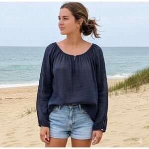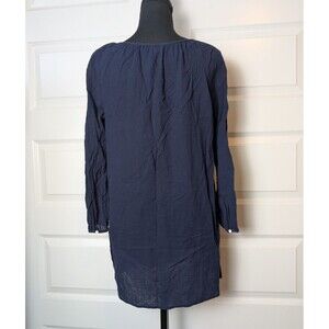 This J Crew Blouse is a relaxed and casual tunic perfect for a variety of occasions including casual outings, workwear, and even parties. Made from 100% cotton gauze, this lightweight and breathable blouse features a scoop neckline and button closure. The solid navy blue color adds a preppy touch to the coastal-inspired design, making it a versatile piece for spring, summer, and fall wardrobes.