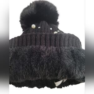 Black Knit Fleece Lined Pom Beanie with Pearls And Rhinestones