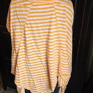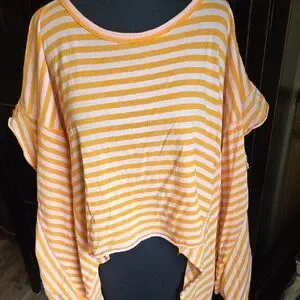Free People orange striped short sleeve tee with tons of fabric for a fun drape effect! Shark bite hem is full and ready to wear with shorts, skirts or whatever you choose! Excellent condition!! Oversized so can be worn off the shoulder as well.
