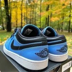 Description: Inspired by the 1985 Air Jordan, the Air Jordan 1 Low University Blue Black sneaker offers a familiar classic look. The Air Jordan 1 Low University Blue Black upper is crafted on a black premium leather base with University Blue tumbled leather overlays that adorn the sneaker from heel to toe. The black accents extend to the Swoosh branding on the lateral and medial sides, tongue, laces, and the ball and wings logo embroidered on the heel. Beneath the feet, a white midsole and black outsole finish off the design.