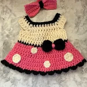 Adorable handmade crochet bear featuring a charming pink dress. Perfect for kids to cuddle and play with.