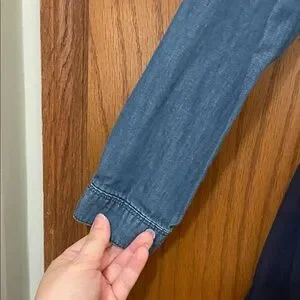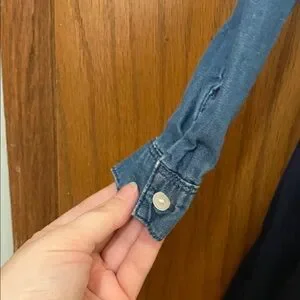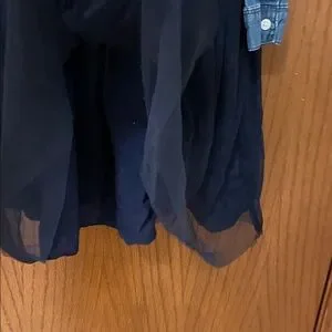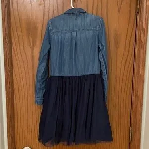 Charming denim top with a navy tulle skirt. Perfect for casual wear. One piece. Real buttons and front pockets. Lined tulle skirt. Size 10. Pet and smoke free home. Good preowned condition.