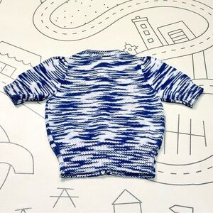 Charming pima cotton sweater with a blue and white pattern. Features button-up front. Perfect for stylish comfort.