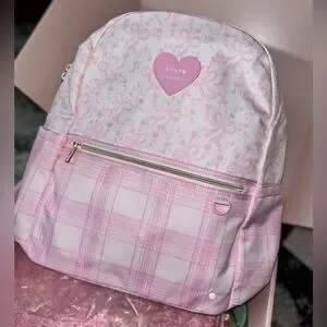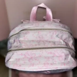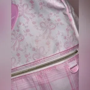 LoveShackFancy state pink coquette bow and gingham print backpack bag double zip with side pockets inside pockets laptop sleeve ect secret crush bow print