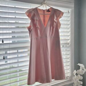 Chic mini dress in soft pink. Features stylish ruffle sleeves. Perfect for any occasion.