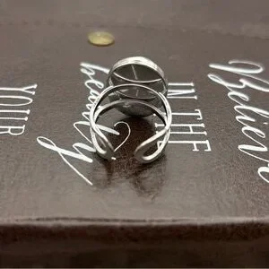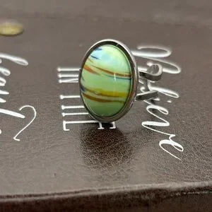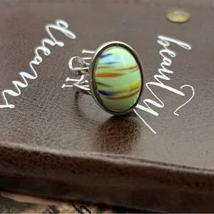 Vintage 1970s-inspired striped ring with bold mint green, blue, and orange tones. The oval cabochon sits in a stainless steel adjustable band with an open back for a comfortable fit. A statement retro piece that adds a pop of color to any outfit.