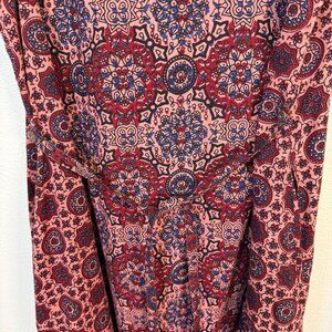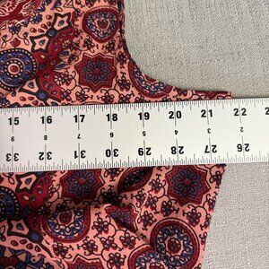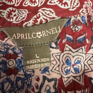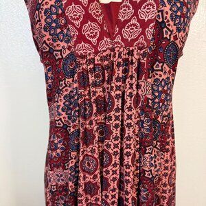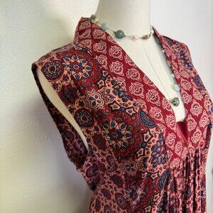 This sleeveless maxi dress by April Cornell features an elegant red and blue floral pattern. Crafted from 100% cotton, it offers a breathable and comfortable wear. Designed in India, its versatile style is ideal for warm weather or layered looks. Pit-to-pit measurement is 22 inches with a full length of 46 inches.