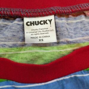 Chucky costume by Spirit. Features a blue dress with colorful stripes. Includes red wig and socks. Brand new, never worn. Smoke free home. Adult XS.