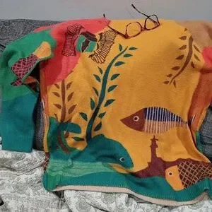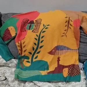 So cute! Vintage sweater, stylish colorful warm. Unique design all over. Actually very light and soft!