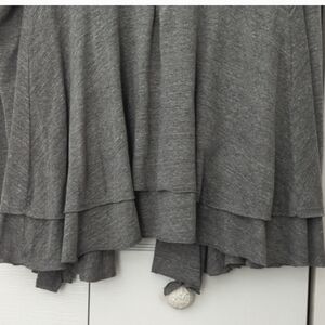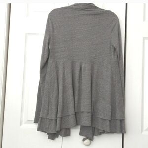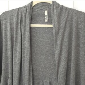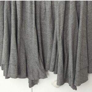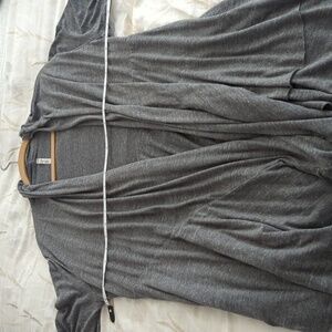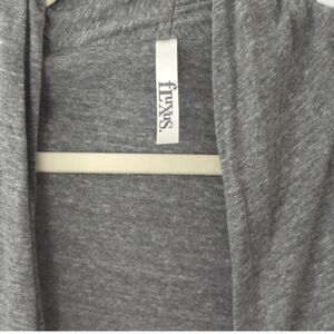 perfect condition, very unique, flattering fit, great to throw on over anything, any time! FLUXUS, marked a size XXL, grey, long sleeve, open front cardigan. Very soft and comfy, like your favorite tee!! Great layered design, see hemline and back! Some out style, great wardrobe piece. Hanging out measures approx. 32.5" long, bust is open, see pics, approx 42" not certainly can accommodate larger due to style.