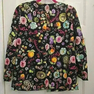 Add a pop of color to your wardrobe with this vintage blazer featuring a fun fruit design. Perfect for adding a touch of whimsy to any outfit, this blazer is sure to turn heads. Made with quality materials, this blazer is a size large and will fit a variety of body types. Ideal for those looking for a unique and playful addition to their wardrobe, this blazer is a must-have.
