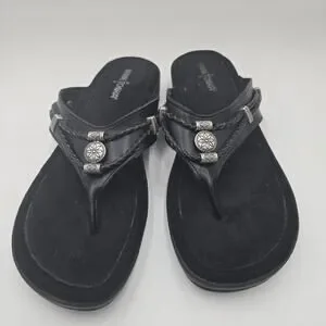MinneTonka Silverthorne Thong Sandals Size 10 Womens Black Leather Concho