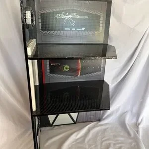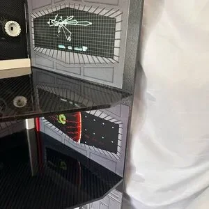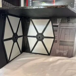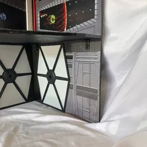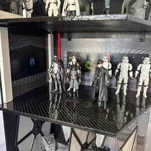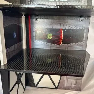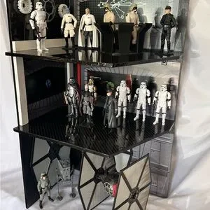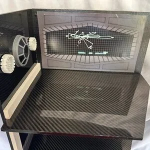 Unique, handmade space-themed display shelf with futuristic design. Features detailed accents from all sorts of Star Wars items. If you love Star Wars this is a one-of-a-kind display! Made with 1/4” painted wood, carbon fiber and various backgrounds.