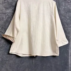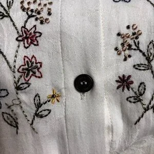 Charming cream button down with floral embroidery. Features three-quarter sleeves and a classic collar.