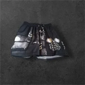 Eric Emanuel shorts with black waistband and gray mesh fabric. Comfortable and stylish.