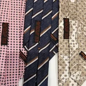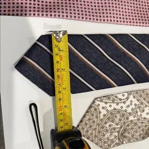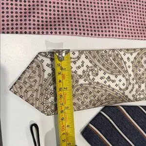 Stylish tie set by Dolcepunta Handmade in Italy Elegant designer ties. 100% seta silk and sure to wow this holiday season. Includes a pink tie with a geometric pattern, a navy tie with stripes, and a beige paisley tie. Perfect for any special occasion