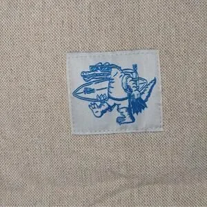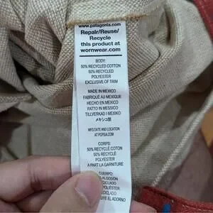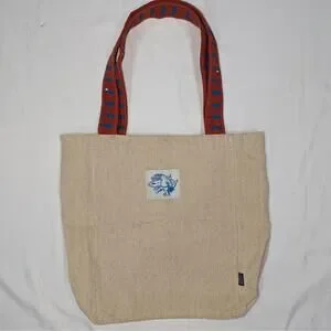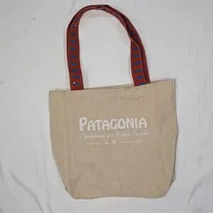 Design details: Natural tan body, red web straps with blue dash pattern, front blue graphic patch, large Patagonia print on back, unlined open top