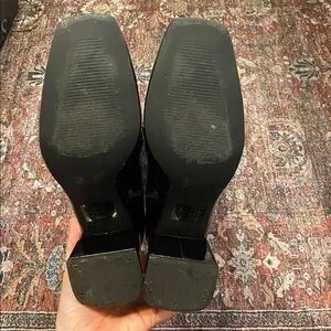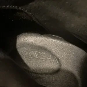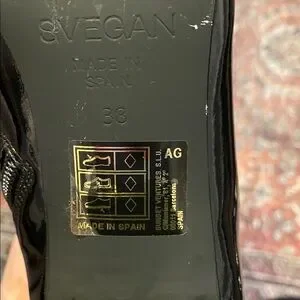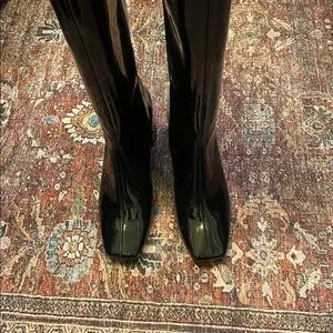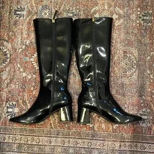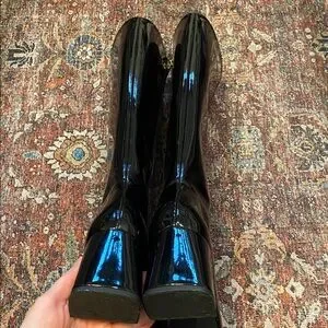 Svegan black patent faux leather knee-high boots. Side zip. Block heel. Perfect for fall and winter outfits. Love these paired with back tights and a mini skirt or dress. Made in Spain. Vegan “leather” boots. Size 38 or a US size 7 1/2. Minimal wear to bottoms of boots but some scuffs here and there primarily at the inside ankle of the boot wear they have hit each other while being worn. Please look at photos and video for reference and please ask if you have any additional questions ☺️