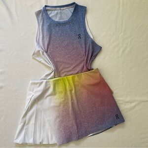 Finish your points with confident style in the ON Women's Courtside Pleat Skirt. It features a colorful gradient print, pleating on the right side, an integrated shortie with side pockets, a bonded hemline, moisture wicking performance, and ON logos on the left front and right back hem.