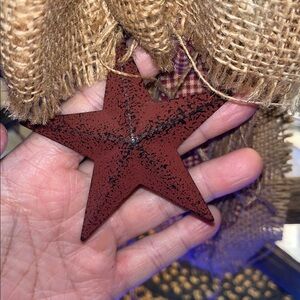 Charming rustic wooden star with burlap accents and a burgundy star. Made with twine and nails. Perfect for adding a cozy touch to any space. Handmade by me, made from old tobacco sticks. Great country decor, NO BUNDLE, last one!