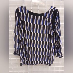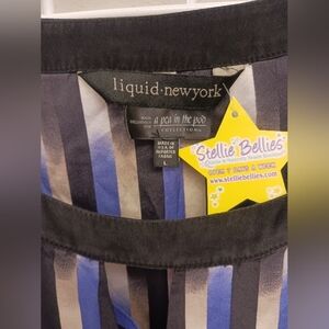 Liquid NY for a Pea in the Pod Maternity blouse. black and blue striped blouse. The blouse has a round neckline and 3/4 length sleeves. The stripes are vertical and vary in width. The blouse is made of a lightweight, flowy fabric. size L