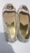 Overall, in good condition, appears worn in and maybe a little stretched around the sides of the toe area, moderate wear on the soles, the leather on the left sole appears, cracked in a few areas as shown and slightly more discolored on the bottom than the other one. Signs of moisture stains on the inside of the shoe.