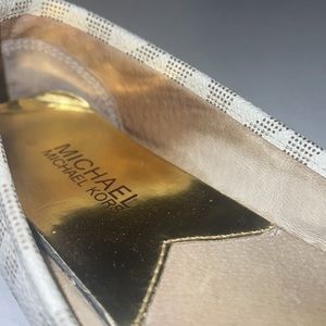 Michael Kors cream and tan gold leather loafers with gold MK round buckle on toe