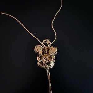 This elegant gold necklace features a stunning floral pendant, perfect for adding a touch of sophistication to any outfit. It was purchased in Singapore and comes in its original box. The length is 20 inches but the position of the pendant is adjustable by sliding it up or down on the chain. The delicate design and luxurious color make it a must-have accessory.