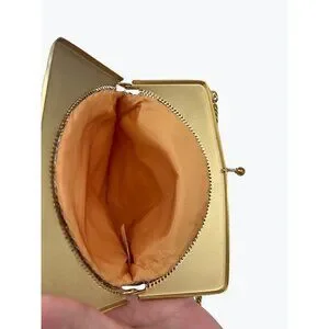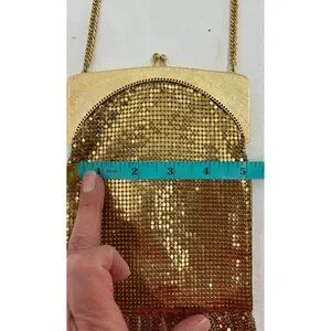 This Whiting & Davis evening purse exudes elegance with its gold mesh design and fringe detailing. The hinged frame ensures secure closure, while the compact interior offers space for essentials. Ideal for formal occasions, its craftsmanship reflects timeless sophistication. Made in the USA, it enhances any outfit with its vintage charm.
