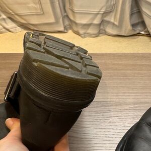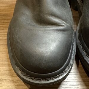 Sleek black leather slip on Meg boots. Features a plaid flannel lining and black stitching. The size is worn off, but I wear a 6.5 and always loved these. Very minimal wear on the outside and a small wear spot on the top inside of the right boot that isn’t noticeable with them on.