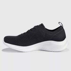 The S Sport by Skechers Women's Resse 2.0 Elastic Gore Sneakers in black, size 11, are designed for comfort and casual wear. Featuring a textured knit upper, stretch-laced pull-on style, padded collar, and tongue, they combine sporty design with easy wear. A die-cut Skechers Memory Foam™ insole provides cushioned support, while the shock-absorbing EVA midsole and soft outsole deliver stability during walking or training. Vegan-friendly and machine washable, these sneakers feature a 1.25-inch heel and are perfect for everyday use.